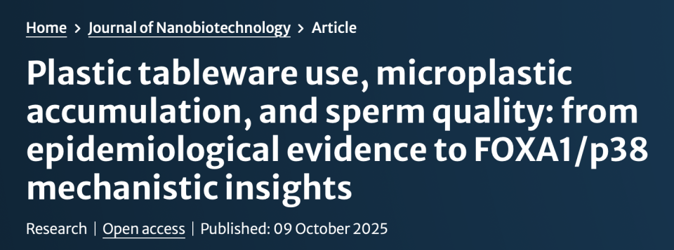2025 年 10 月 19 日,重庆医科大学团队在生殖健康领域期刊发表的研究成果,首次明确了微塑料在人类生殖系统的存在及其危害 ——55.5% 的男性精液样本中检测到微塑料颗粒,且频繁使用塑料餐具人群的精子浓度较对照组降低 33.23%,该降幅已接近世界卫生组织定义的男性生育力风险阈值。